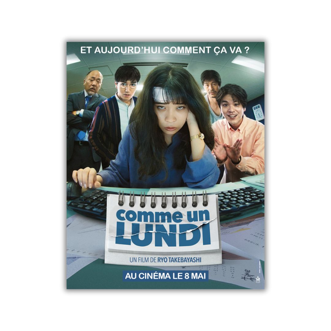 L’affiche du film COMME UN LUNDI dans lequel Yoshikawa et ses collègues, en plus des galères au bureau, sont piégés dans une boucle temporelle… qui recommence chaque lundi ! Entre deux rendez-vous client, réussiront-ils à trouver la sortie ?