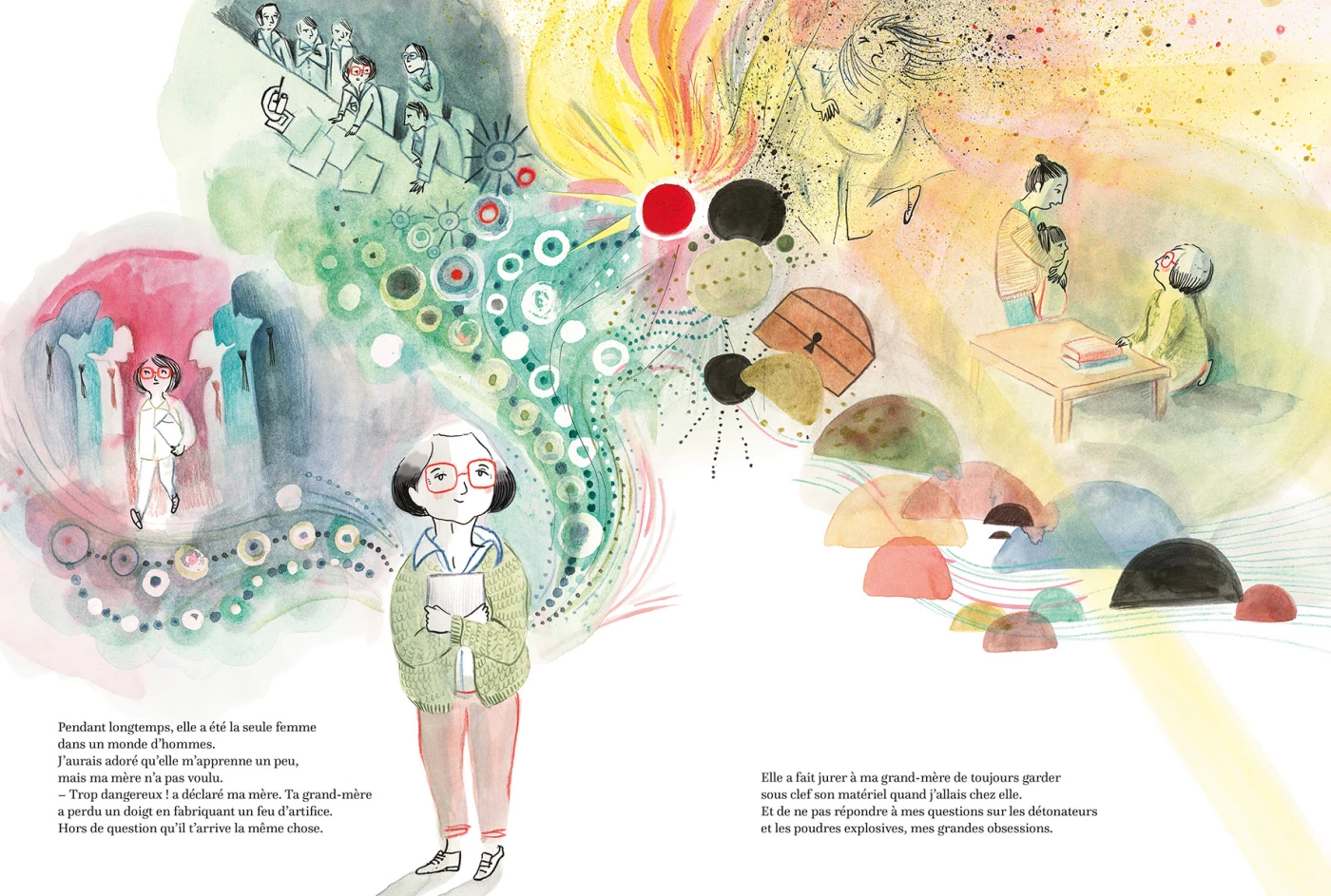 Au Japon, créer un feu d’artifice est un art. Un métier dangereux réservé aux hommes, les hanabishi – métier qu’exerce pourtant la grand-mère de la narratrice, seule dans un monde d’hommes. La petite fille est curieuse : elle voudrait apprendre et comprendre, mais sa propre mère le lui a interdit. Pas question qu’elle perde un doigt, comme la grand-mère, à manipuler d’aussi dangereux explosifs ! L’enfant têtue insiste, alors la grand-mère ouvre son album de photos. Et se met à raconter le ciel, les étoiles, le cosmos…
